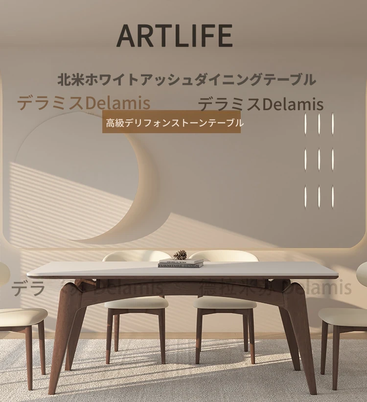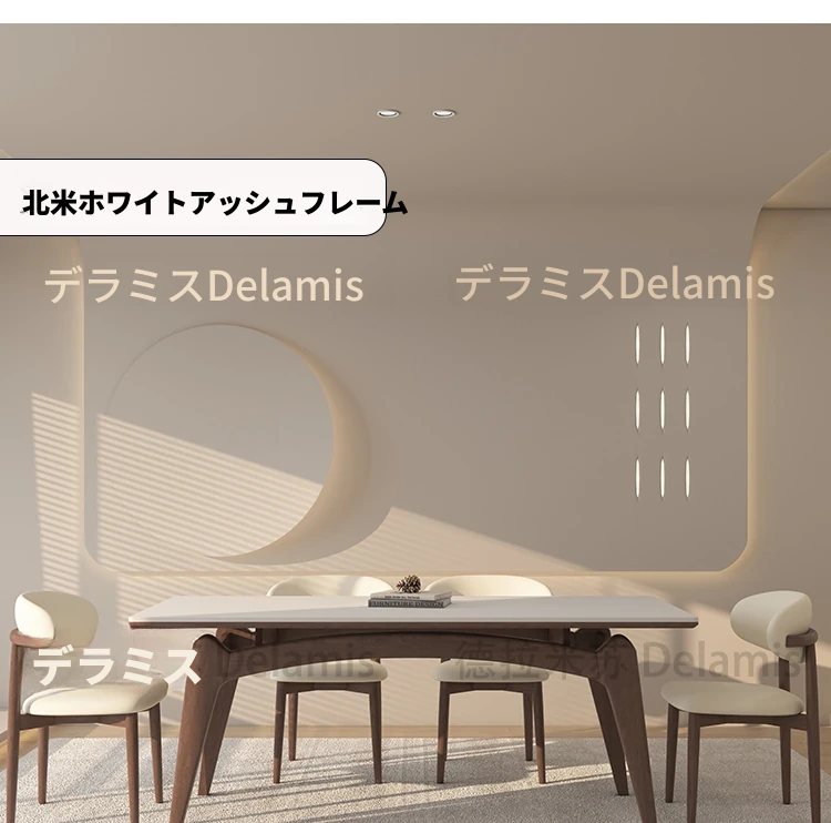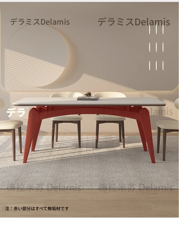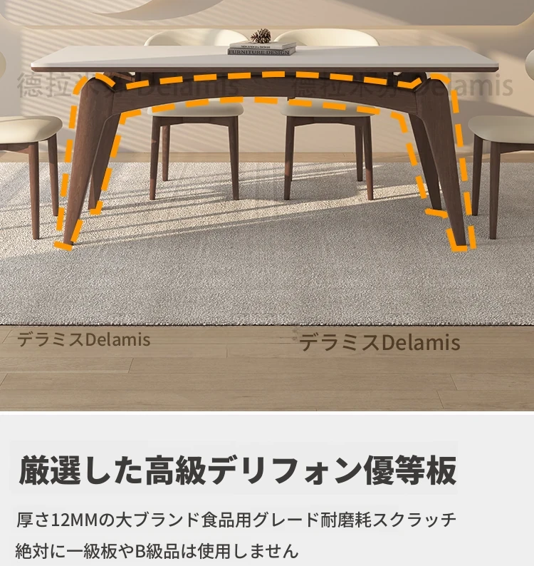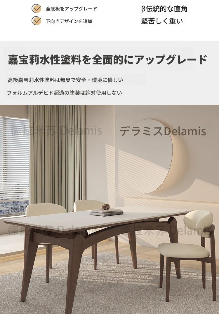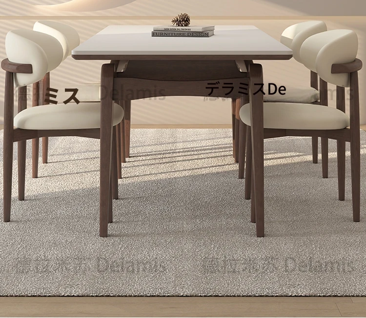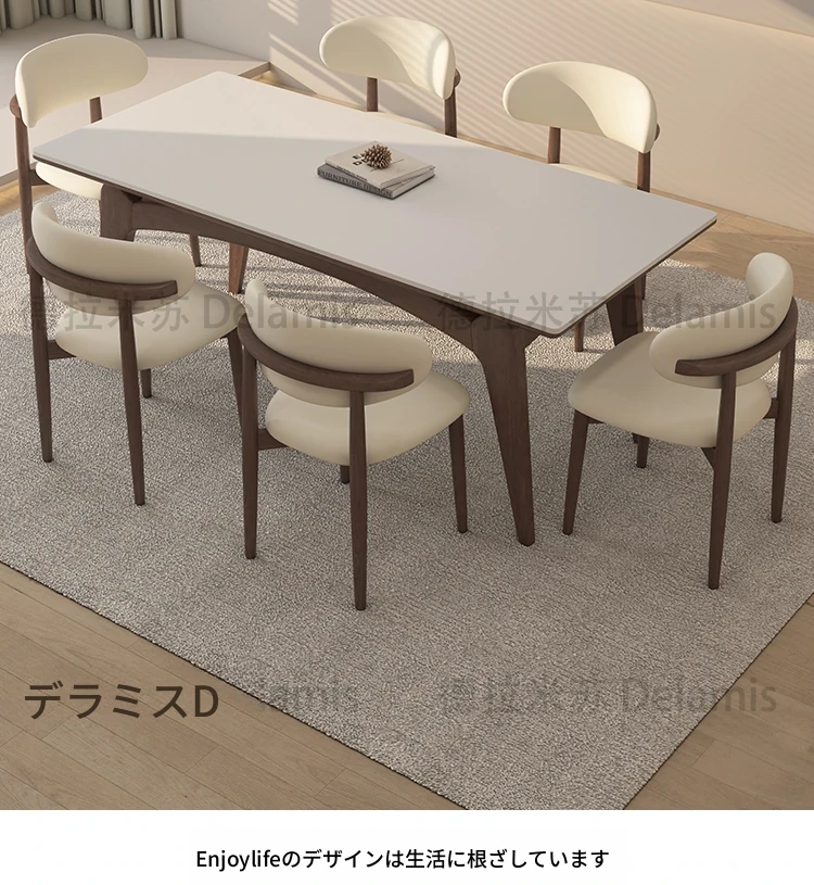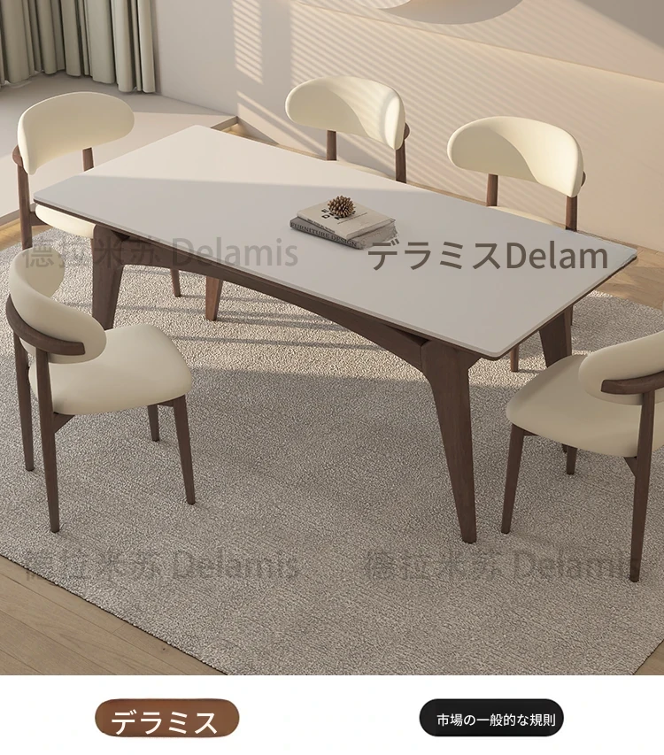 デリフォンの無垢材ロックボードダイニングテーブル - 家庭用・小型住宅向けのモダンでシンプルな高級長方形テーブル。自然な木の温もりを感じながら、食事を楽しむ特別な空間を演出します。