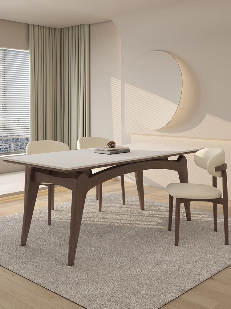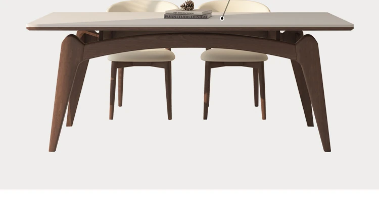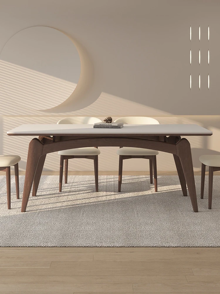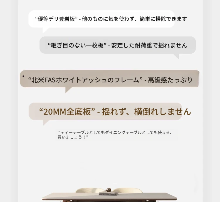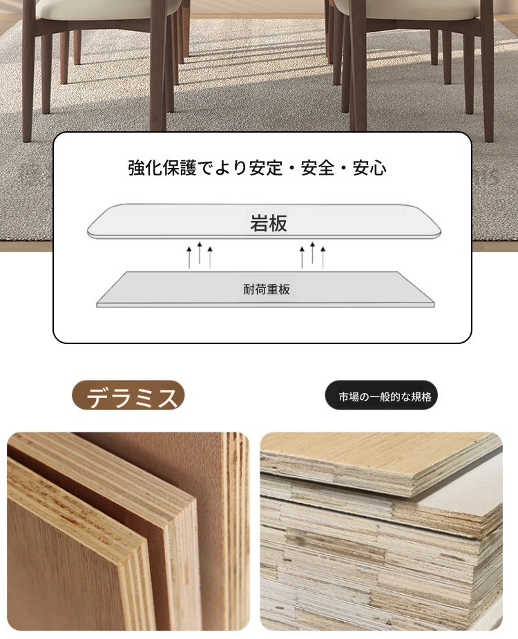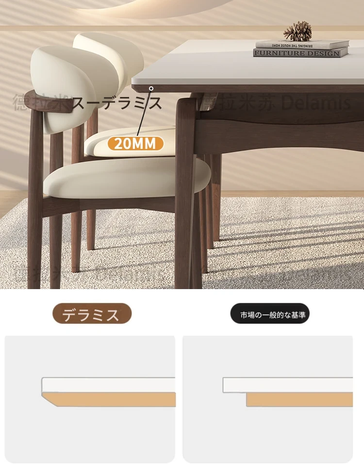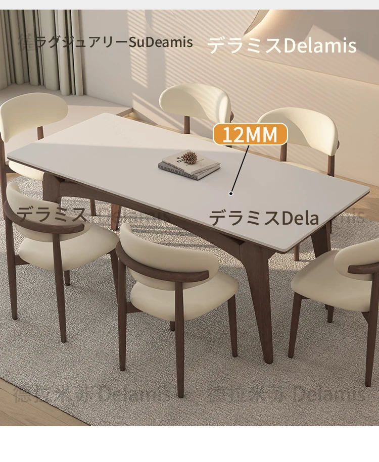 デリフォンの無垢材ロックボードダイニングテーブル - 家庭用・小型住宅向けのモダンでシンプルな高級長方形テーブル。自然な木の温もりを感じながら、食事を楽しむ特別な空間を演出します。
