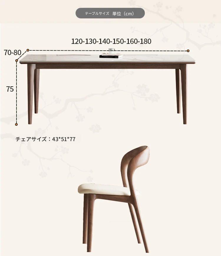 1.8*0.8メートル【高級デリフォン岩板】+無垢材ダイニングチェア*4