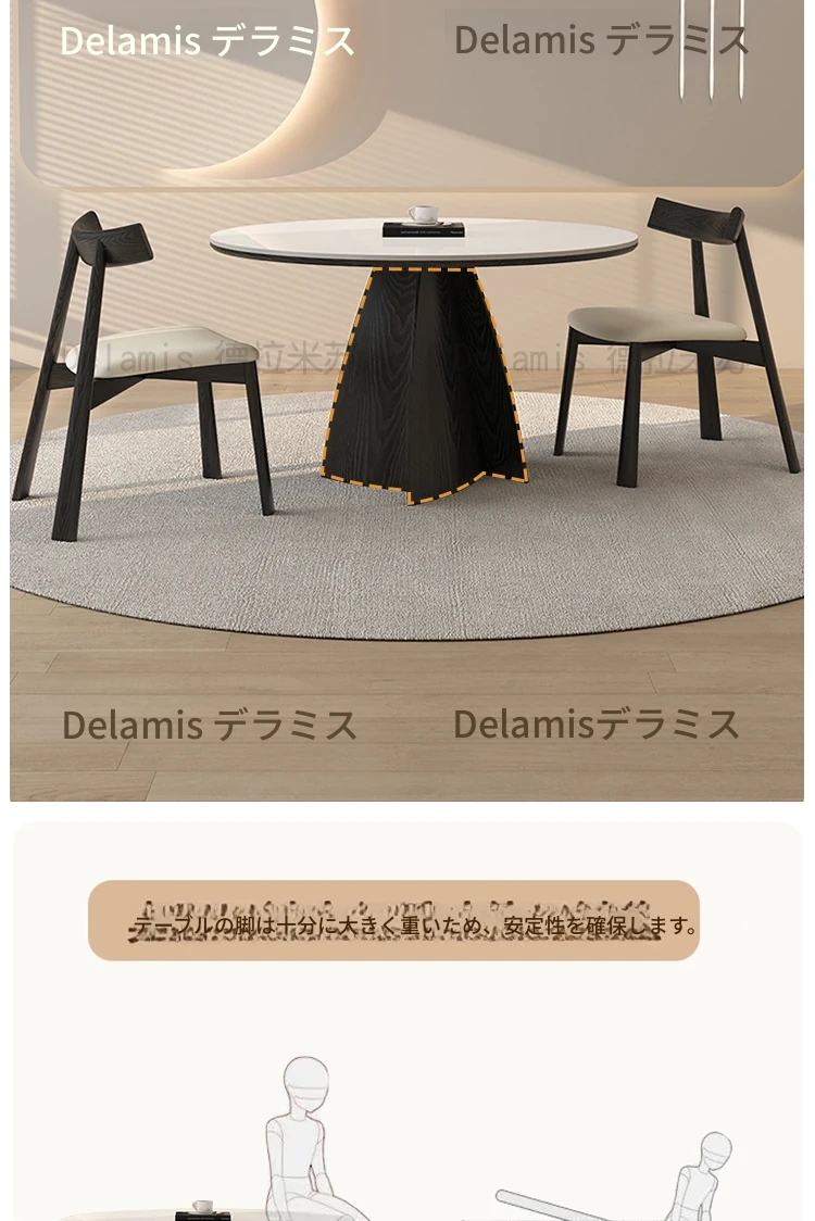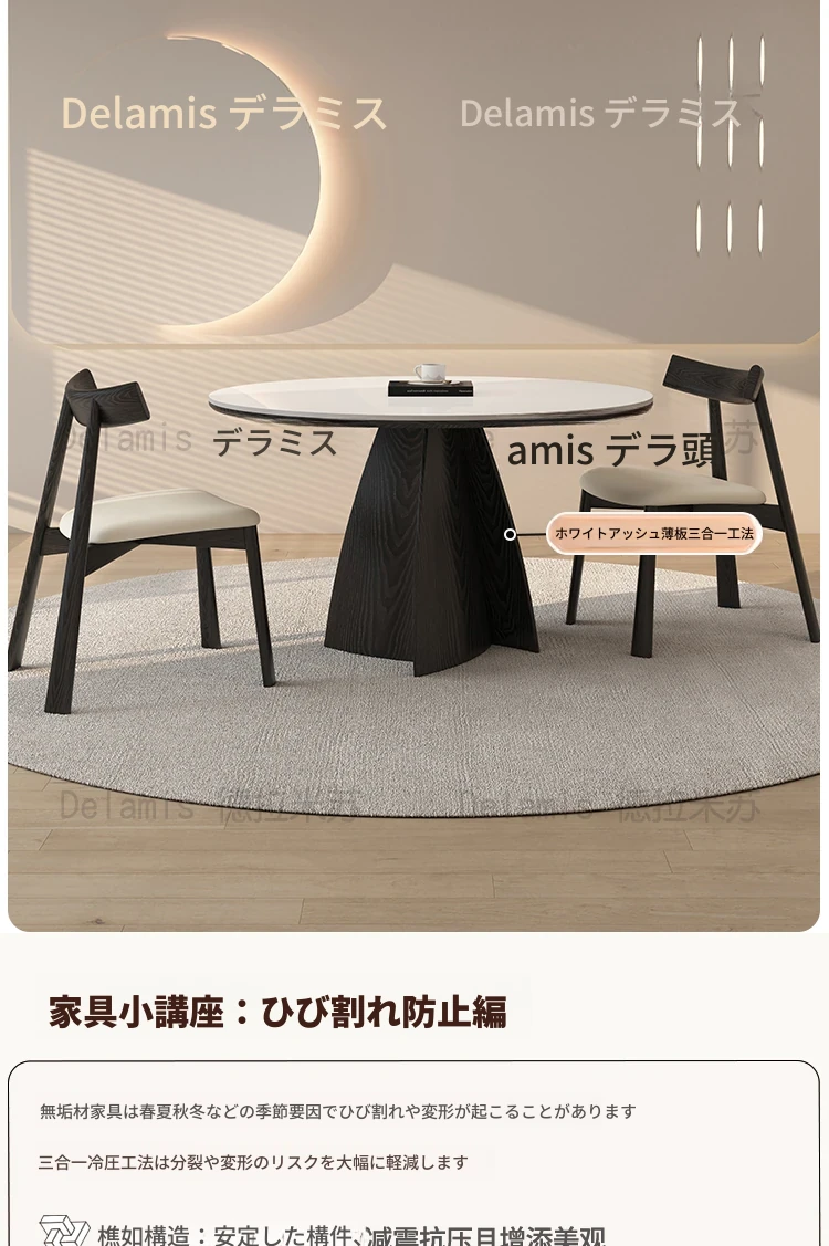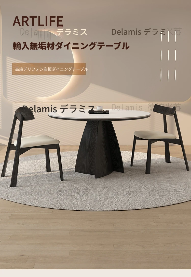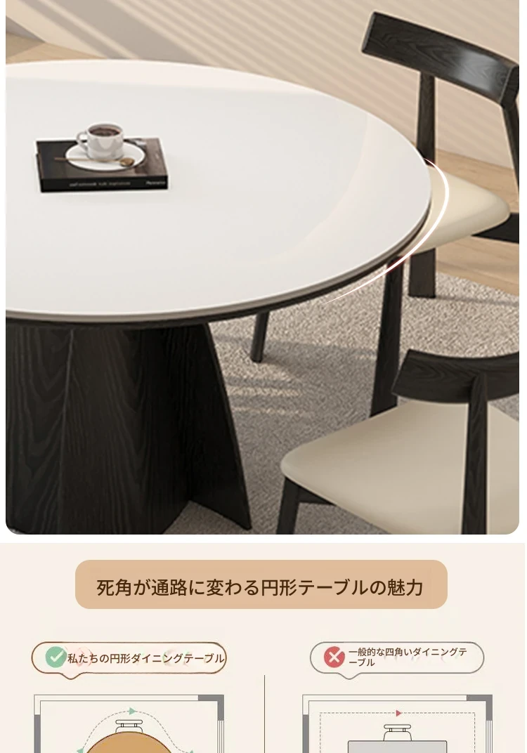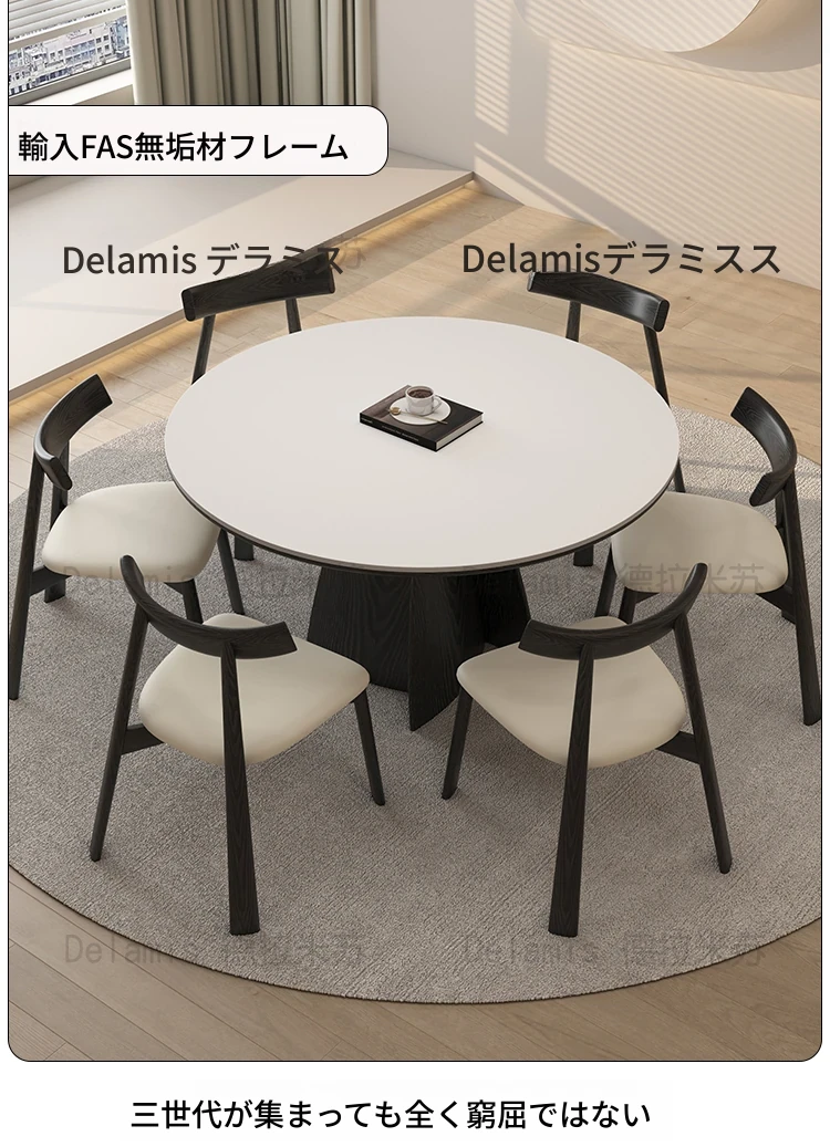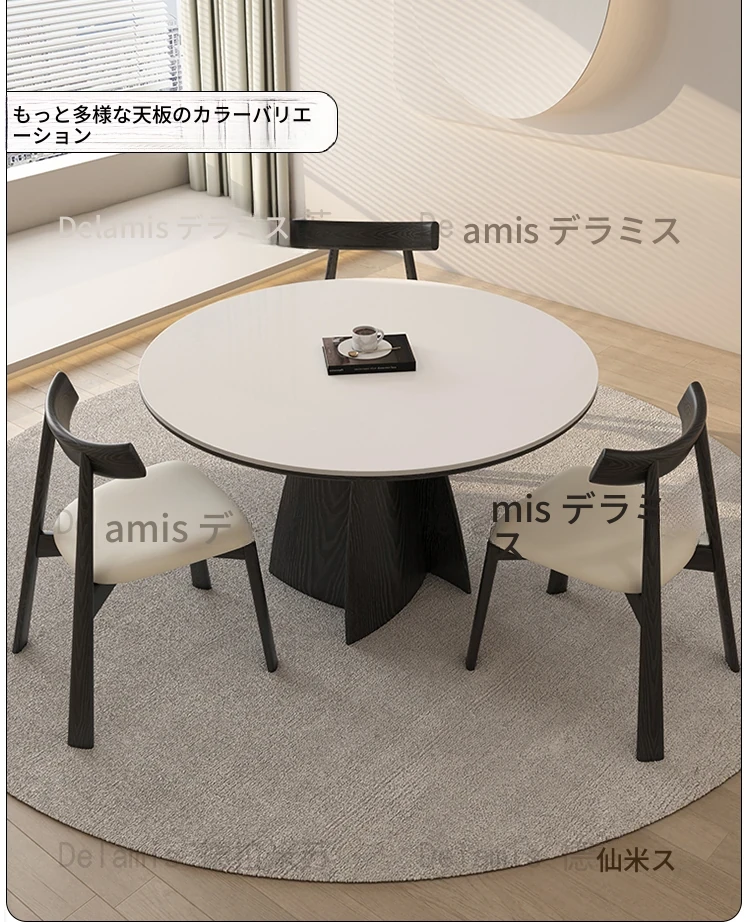 デリフォン無垢材のラウンドテーブル - 家庭用クリーム色ミッドセンチュリースタイル、高級感あふれる全周囲デザインの円卓で、心地よい食事のひとときをお届けします。