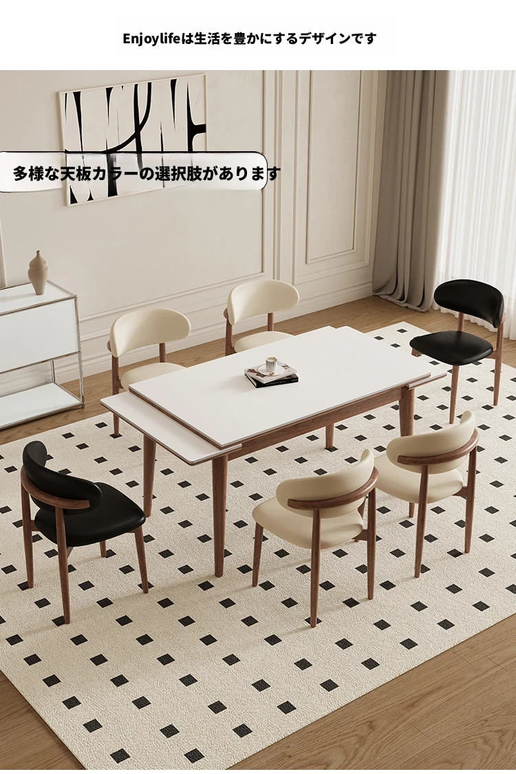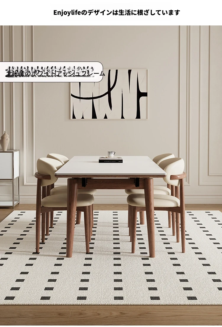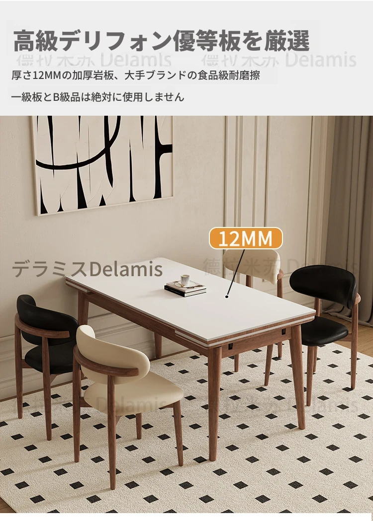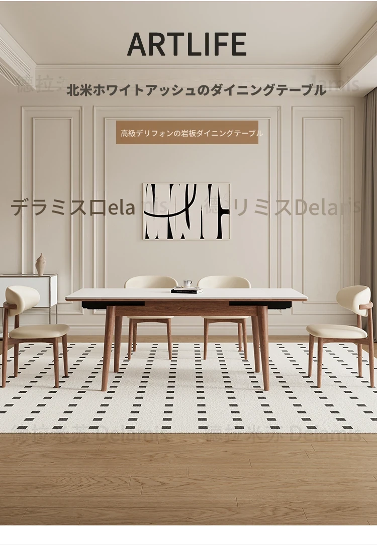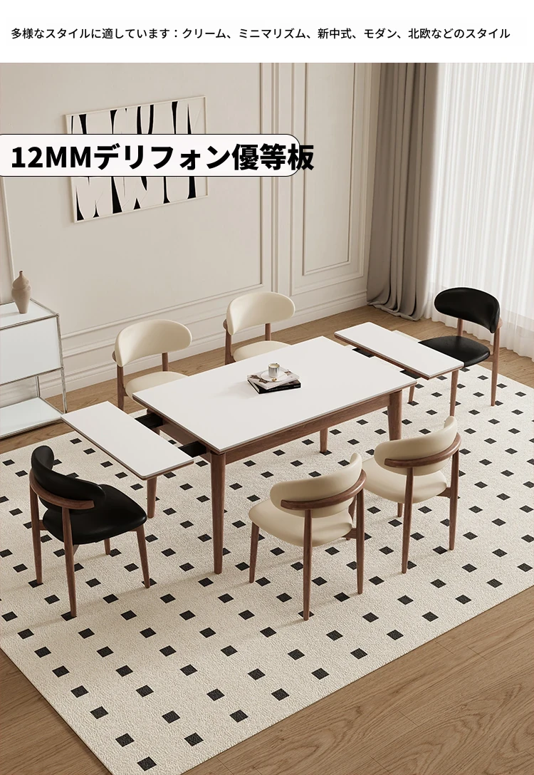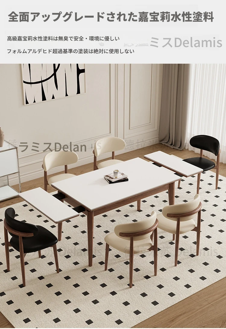 伸縮可能なデリフォン無垢材ロックプレートダイニングテーブル - 家庭向けの長方形クリーム色のミニマルなヴィンテージスタイル、小さなスペースでも快適にお食事を楽しめます!