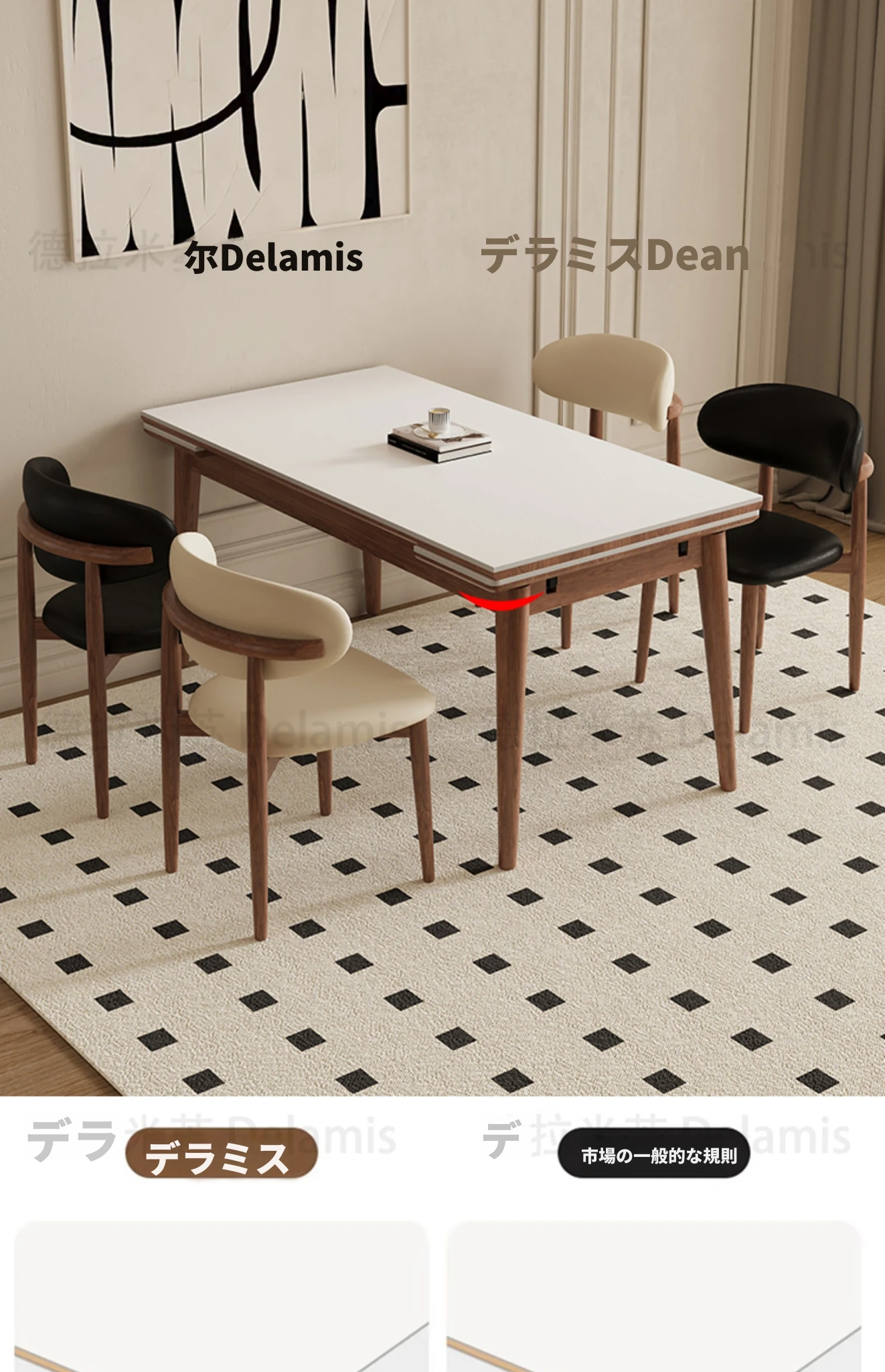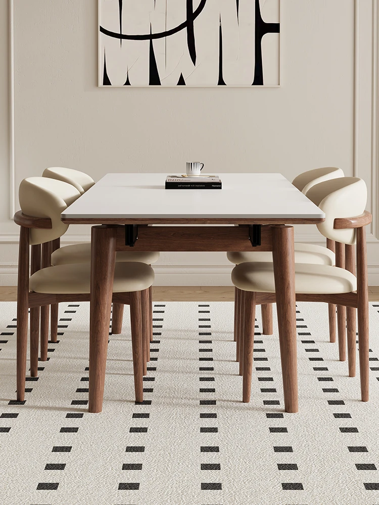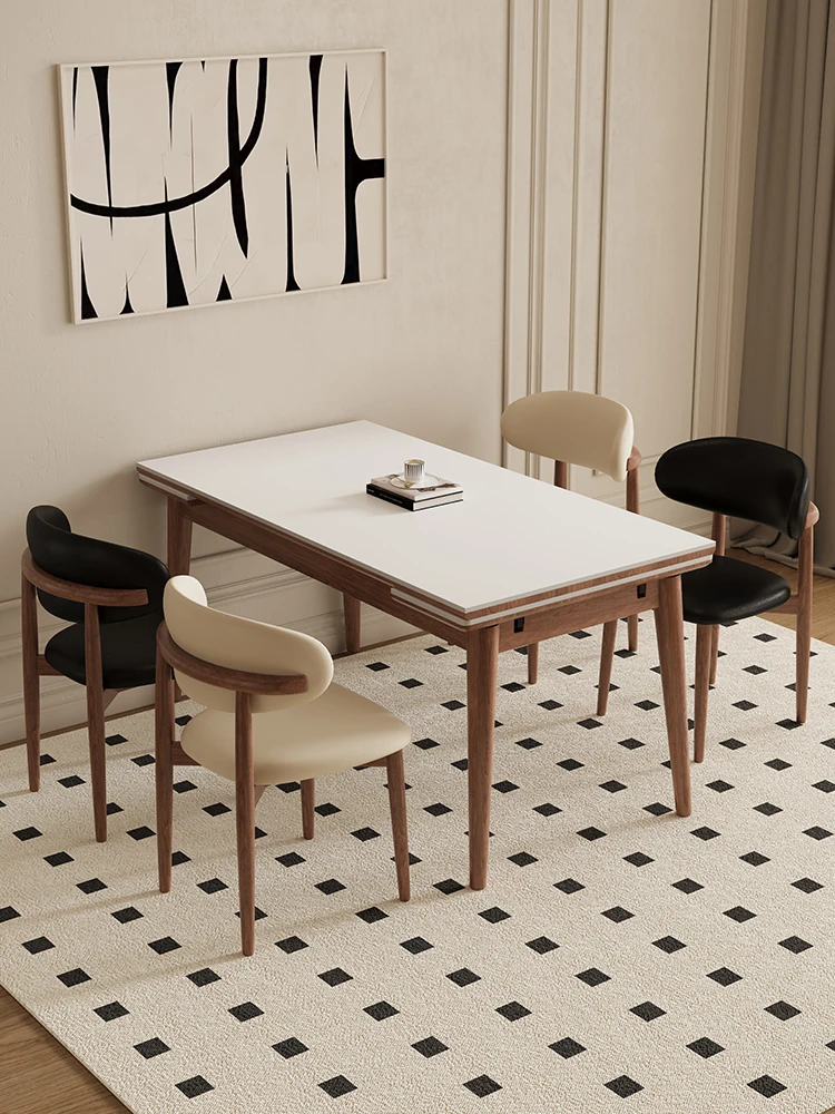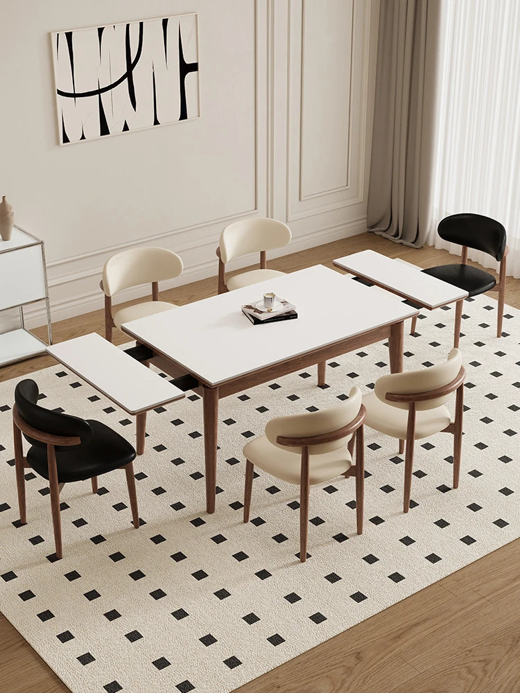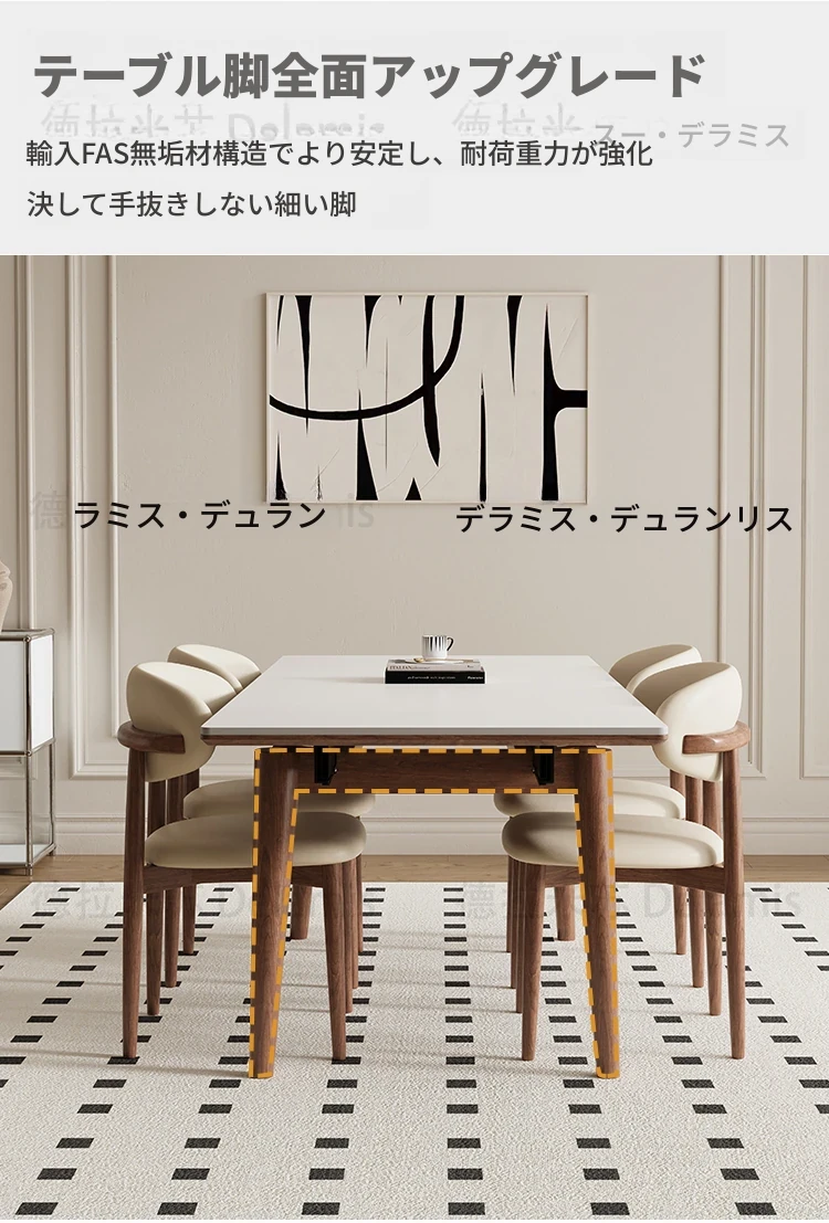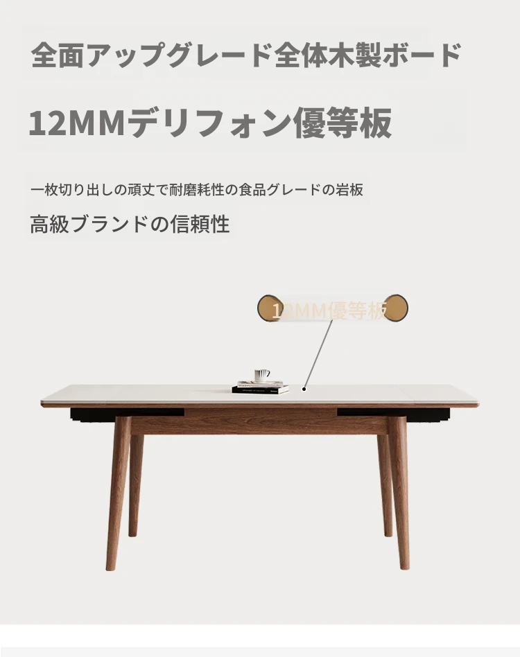伸縮可能なデリフォン無垢材ロックプレートダイニングテーブル - 家庭向けの長方形クリーム色のミニマルなヴィンテージスタイル、小さなスペースでも快適にお食事を楽しめます!