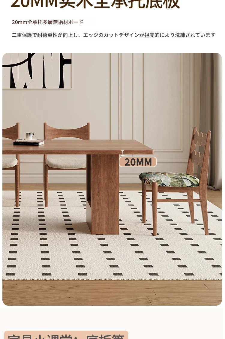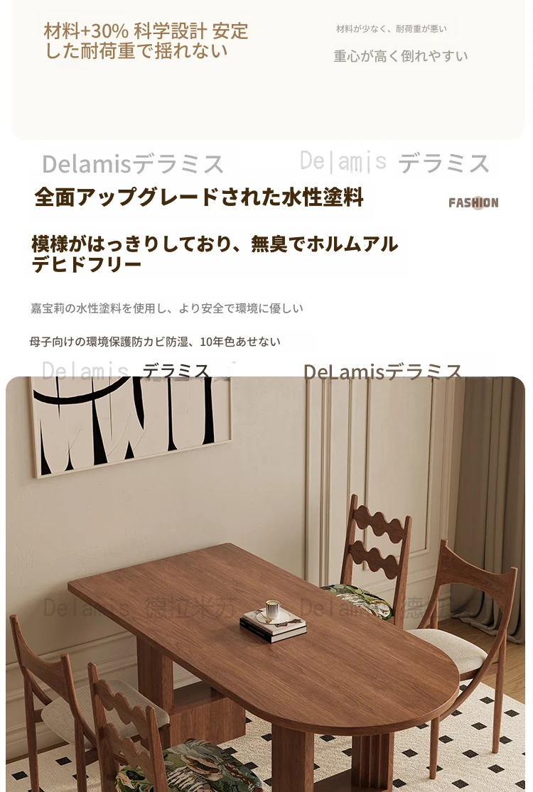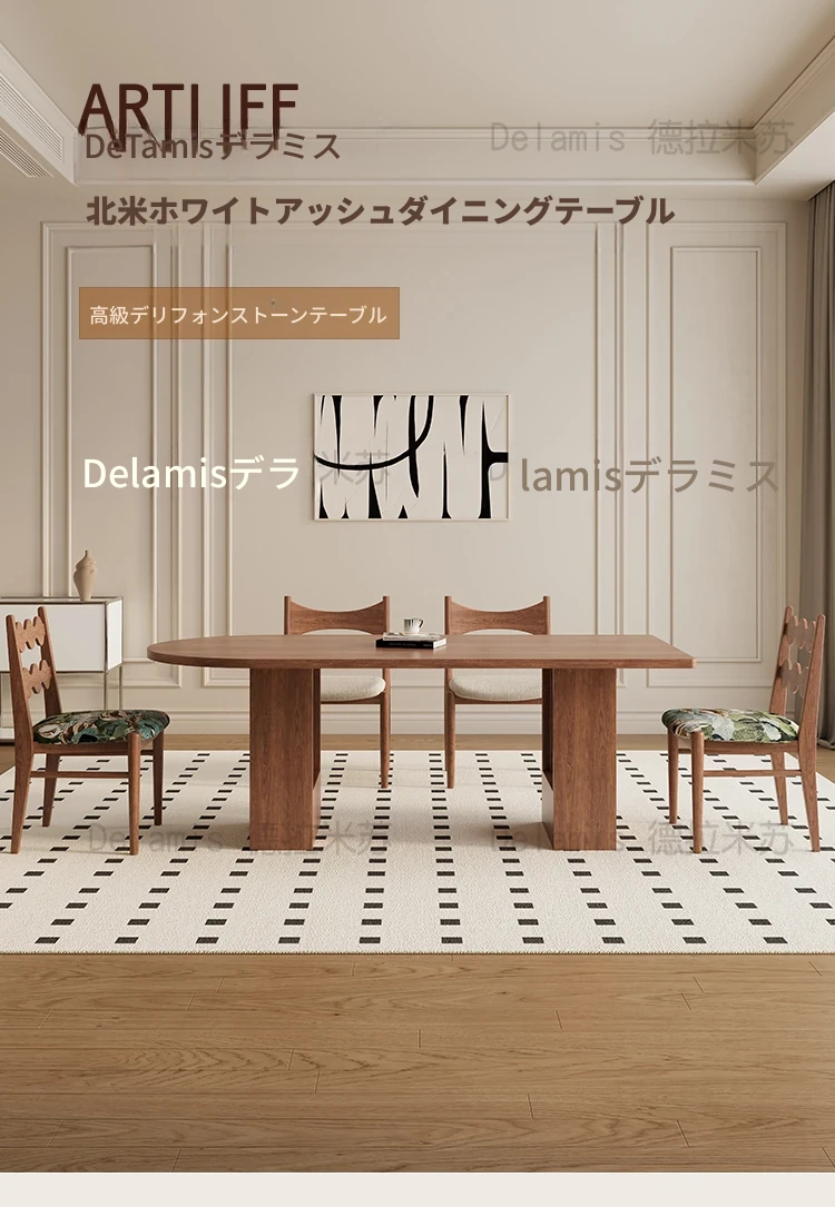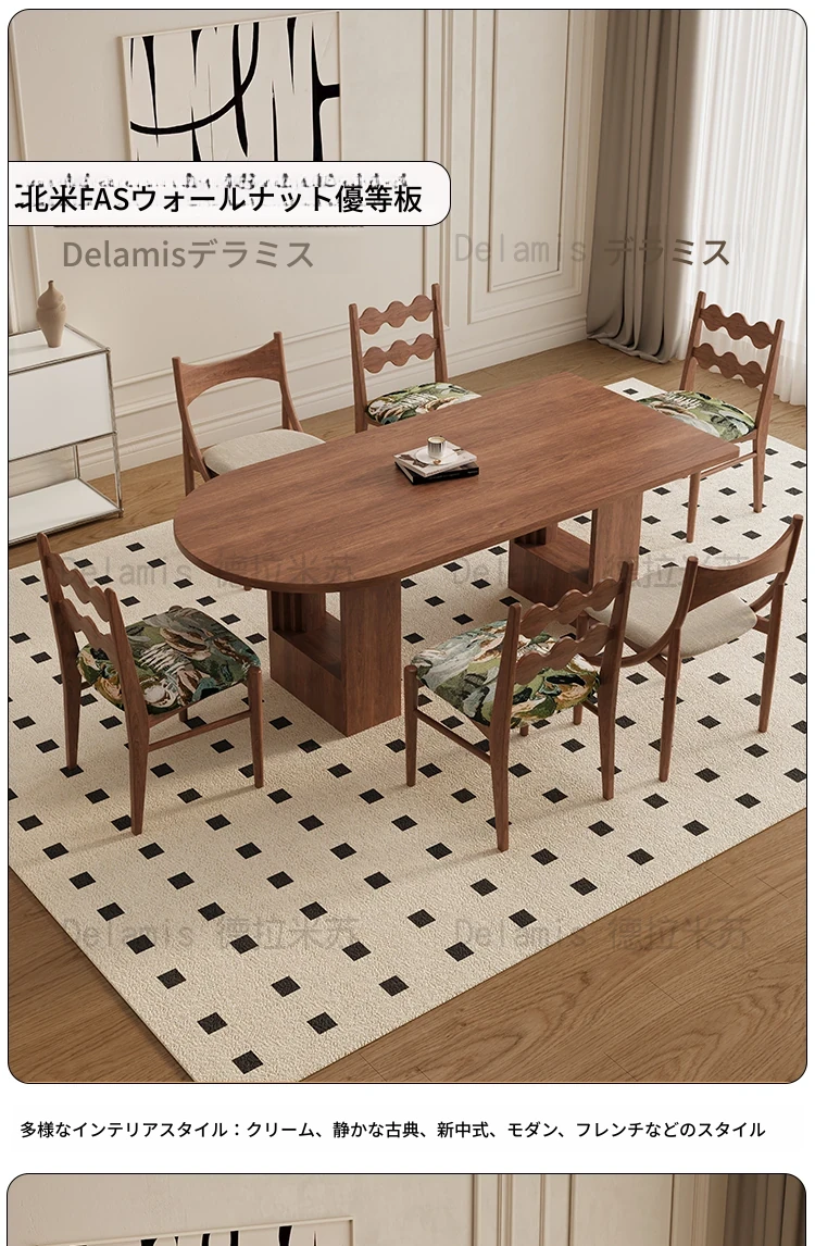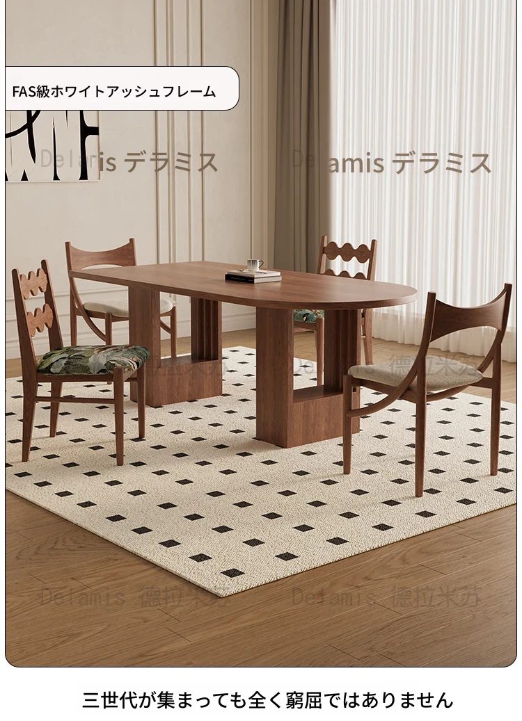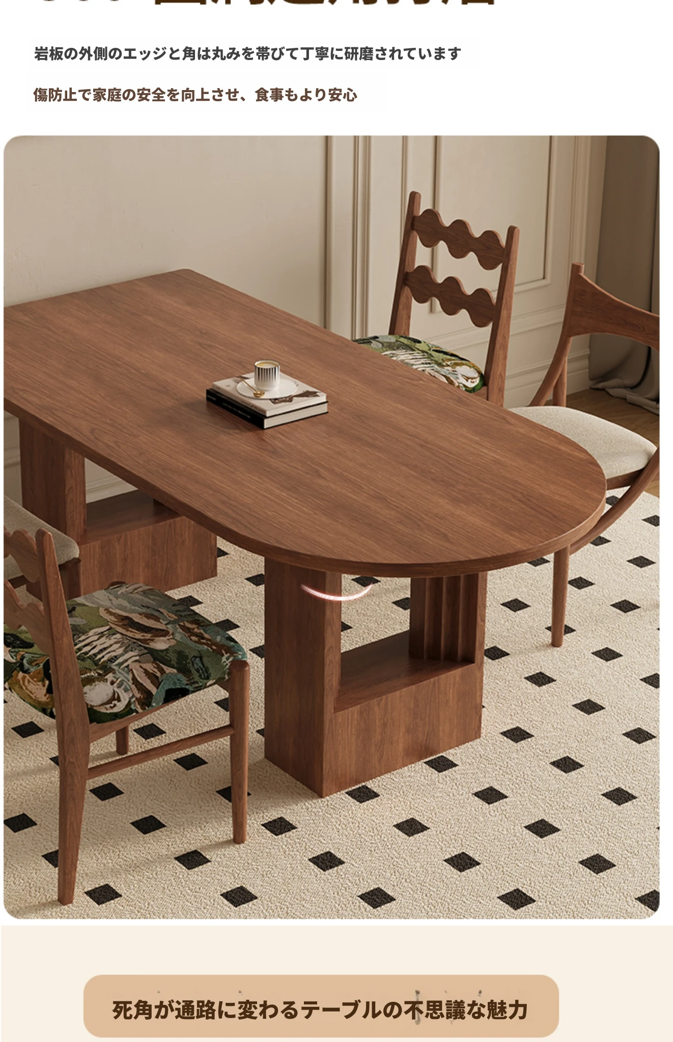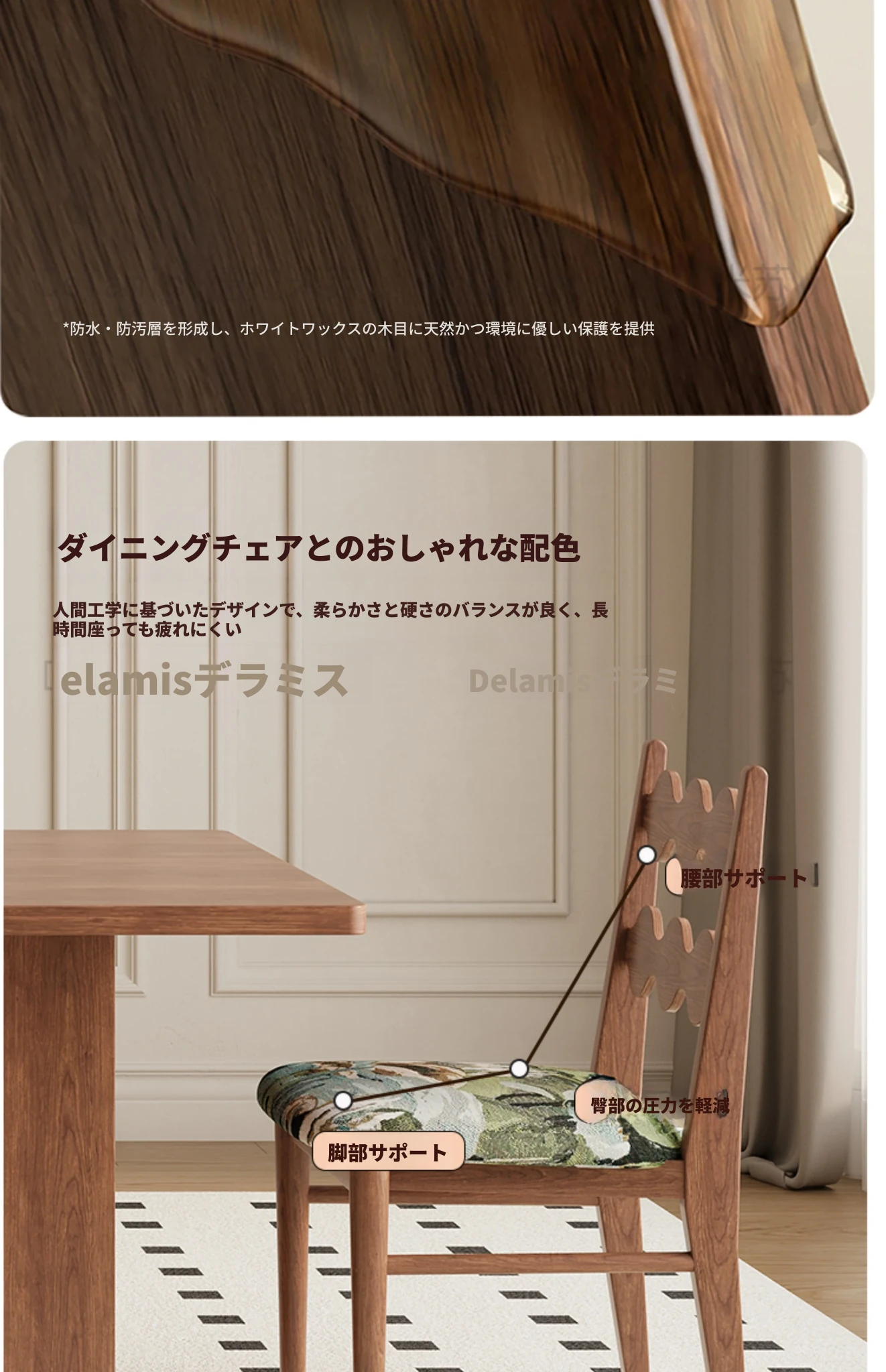 フレンチクリームスタイルの無垢材ダイニングテーブル - ナッツブラウンの長方形デザイン、コンパクトな小型住宅に最適!おしゃれで温かみのある食卓を演出します。