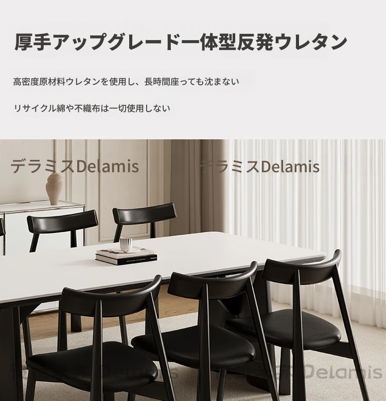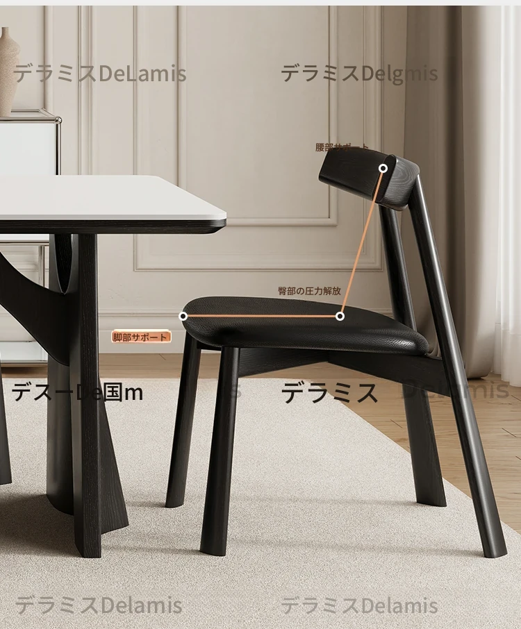 高級感あふれる無垢材のホワイトアッシュ製ダイニングチェア。ブラックのソフトパッド背もたれ付きで、リラックスできるひとときを提供。全て無垢材使用の贅沢なデザインで、書斎やティータイムにも最適です。