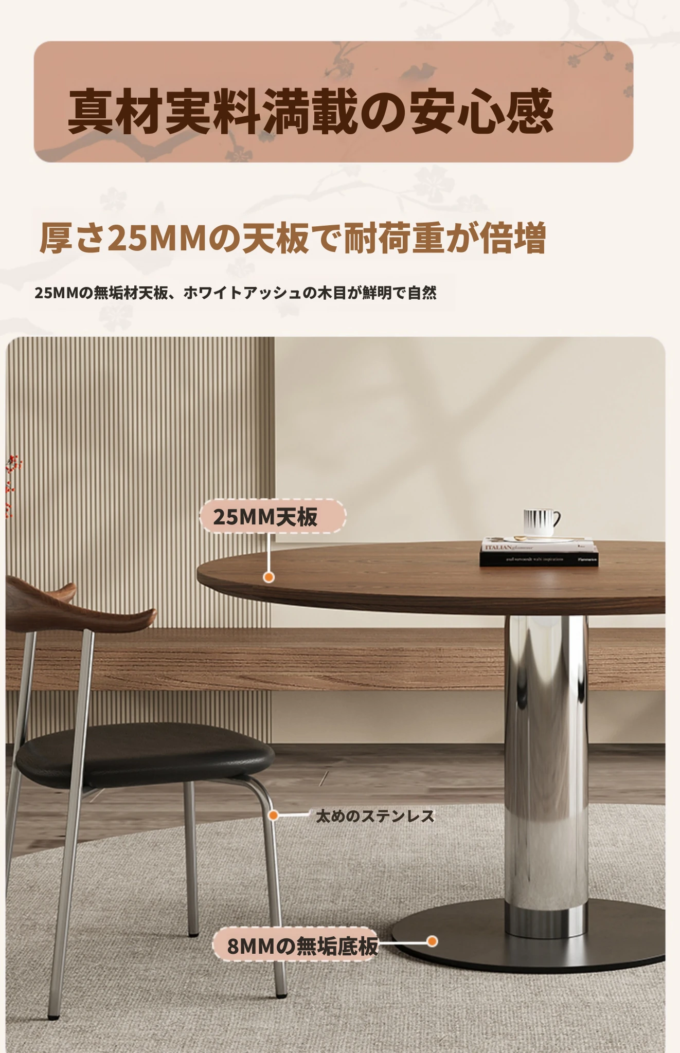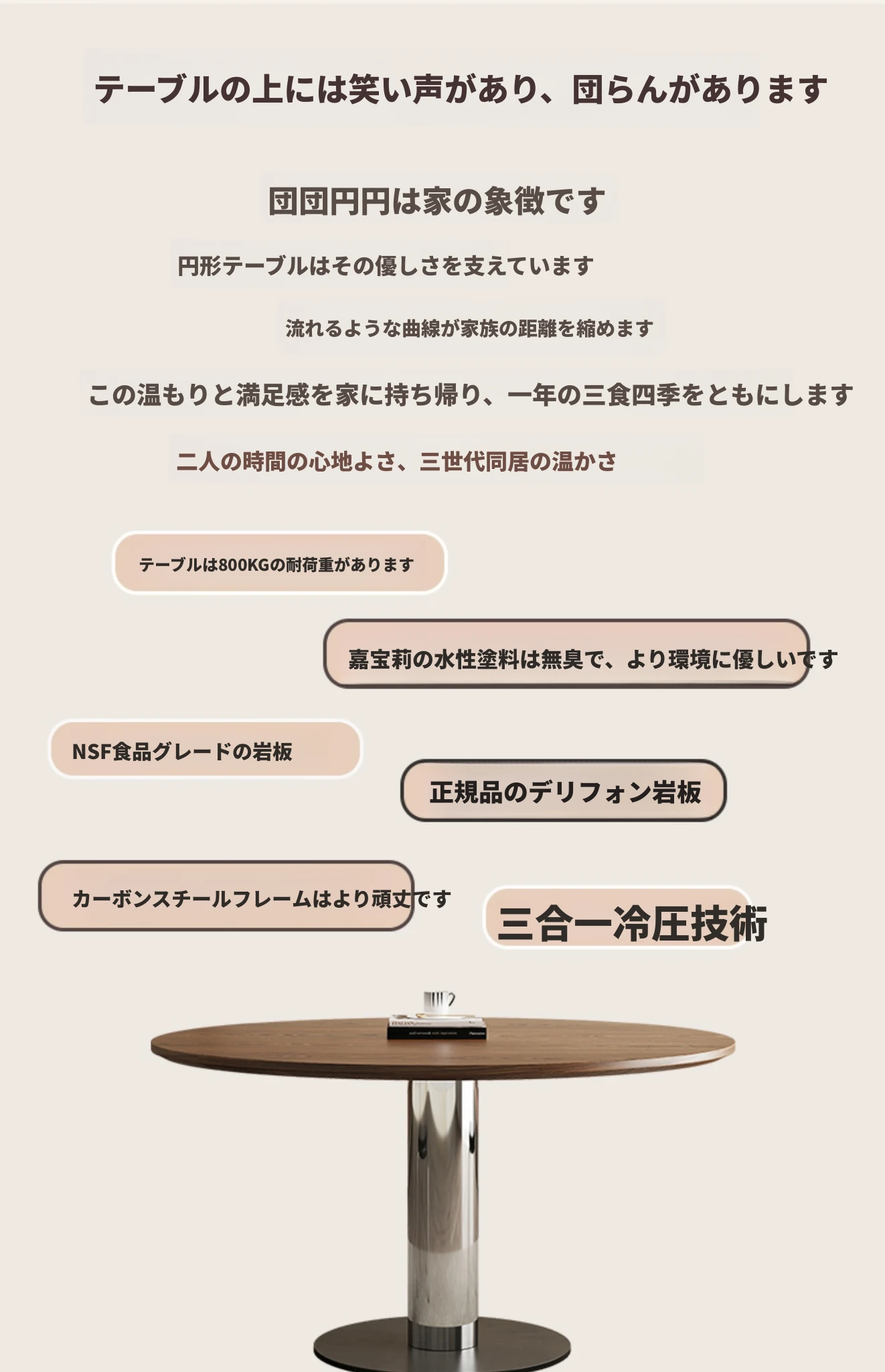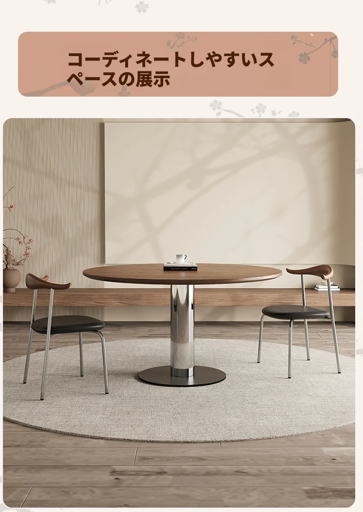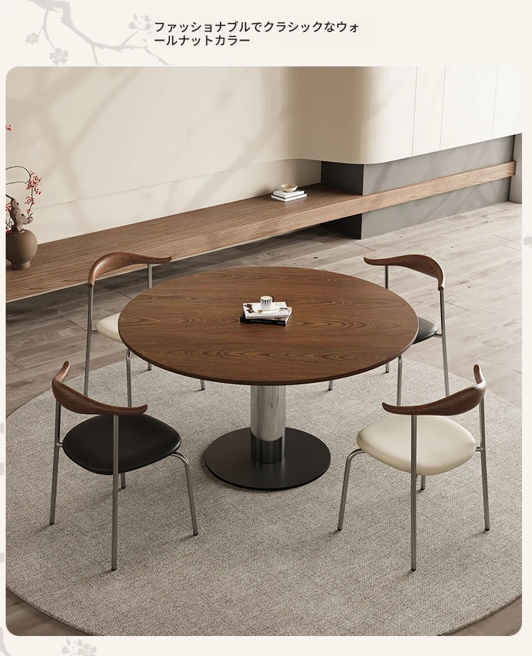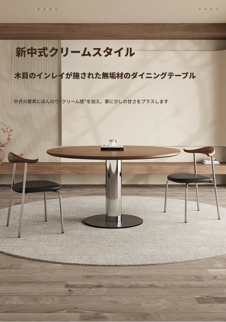 レトロ調の無垢材ダイニングテーブル - 小型住宅に最適なクリーム色の中古風ラウンドウォールナットテーブル。おしゃれで温かみのあるデザインで、家族の団らんを演出します。