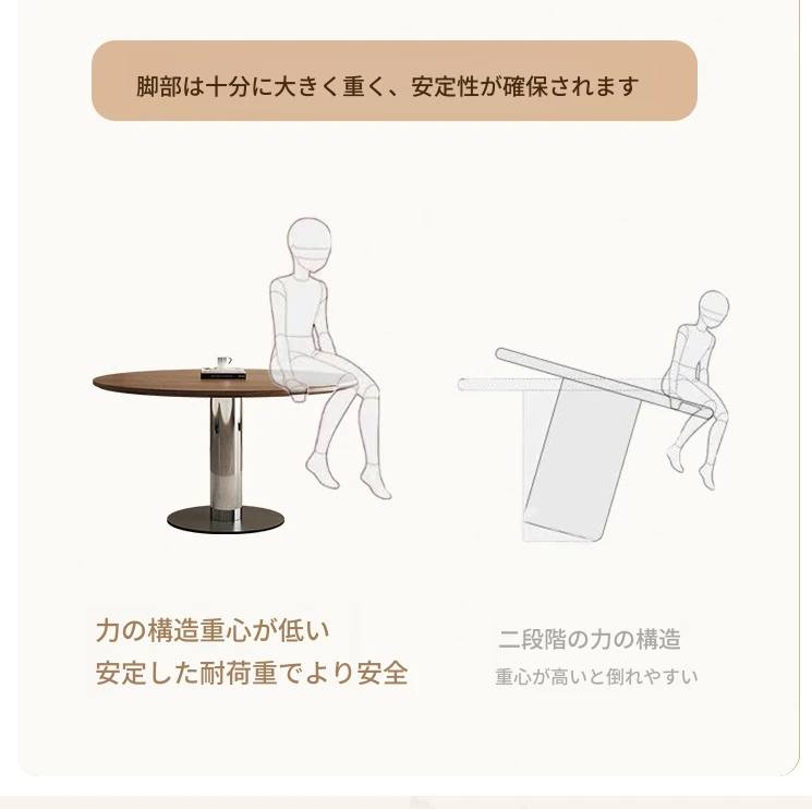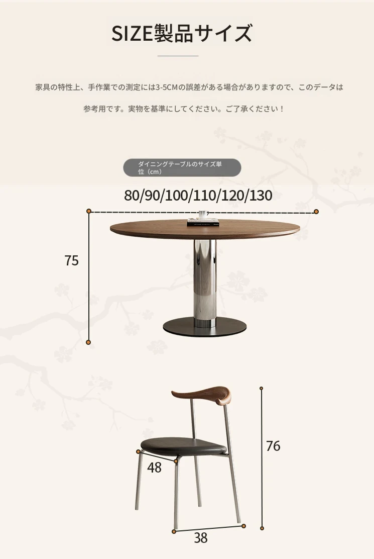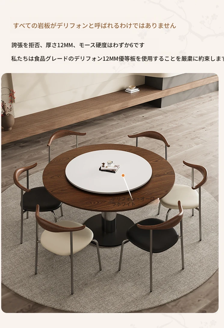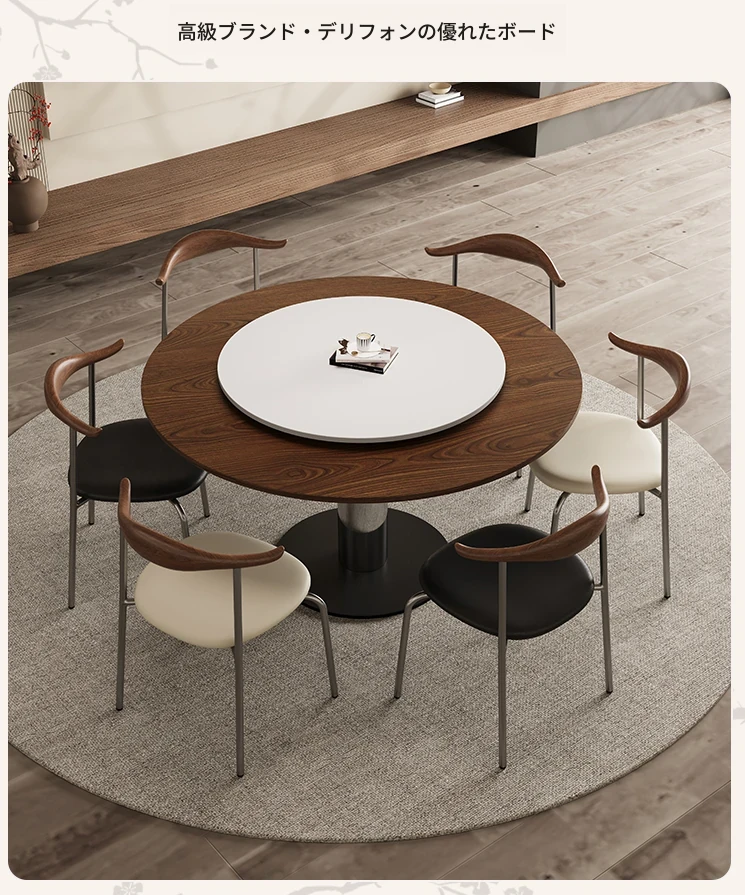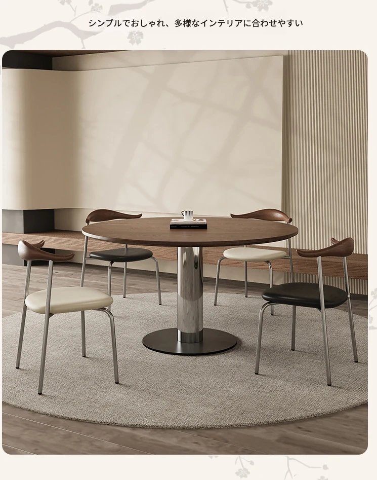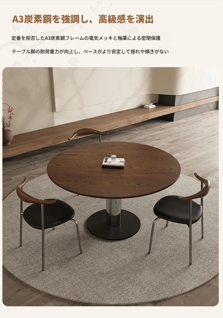 レトロ調の無垢材ダイニングテーブル - 小型住宅に最適なクリーム色の中古風ラウンドウォールナットテーブル。おしゃれで温かみのあるデザインで、家族の団らんを演出します。